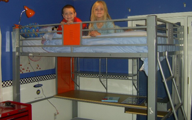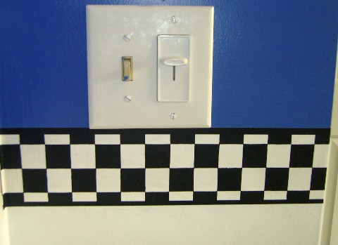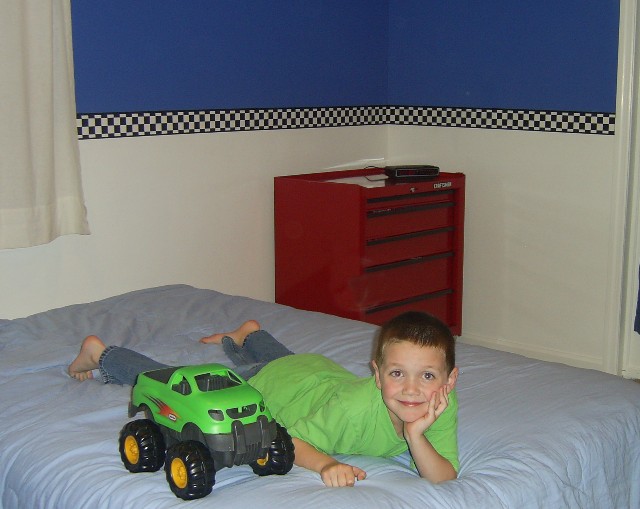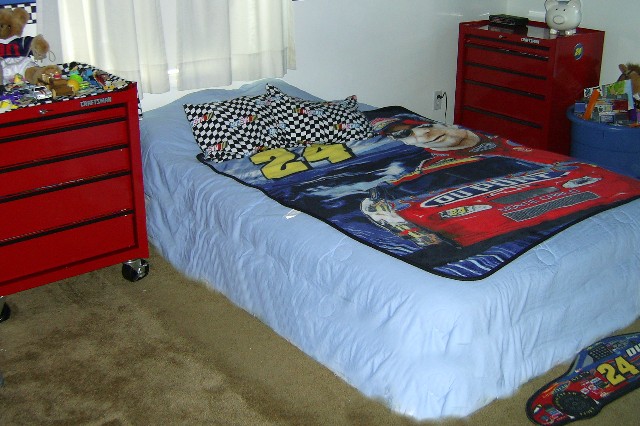 Here's his room. It's not quite done, yet. But you get the idea. The border is a checkered flag. The dressers are Craftsman toolboxes. We have a cool picture of Jeff Gordon's car that will be hung up as well as other racing stuff. |