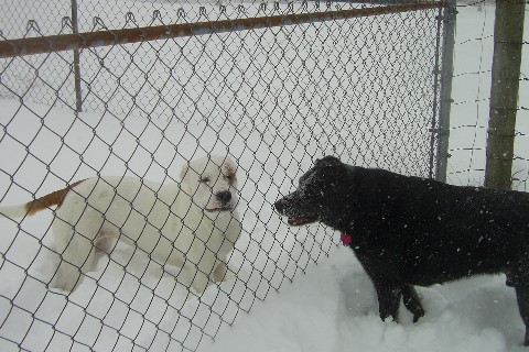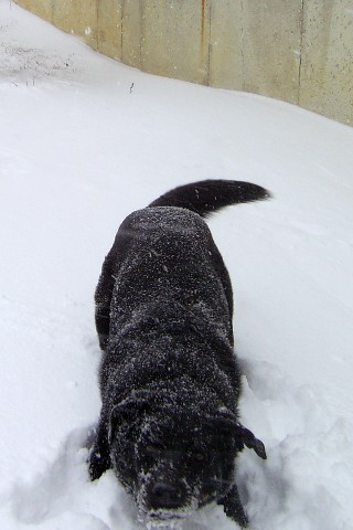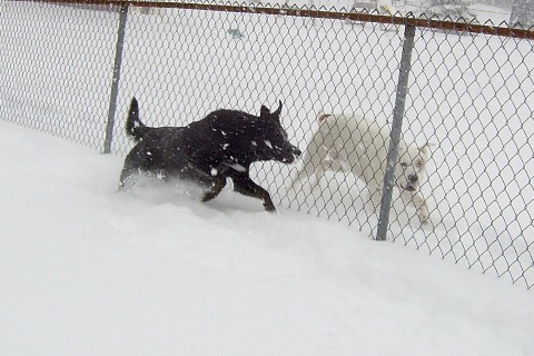 Jake sure knows how to have fun in the snow chasing his friend Lola.