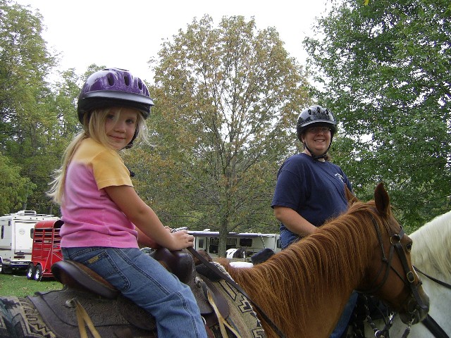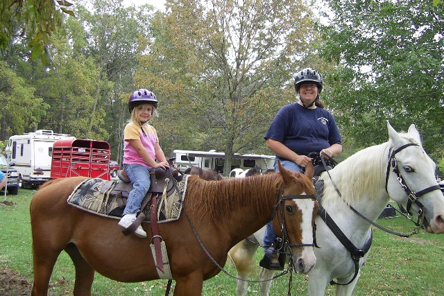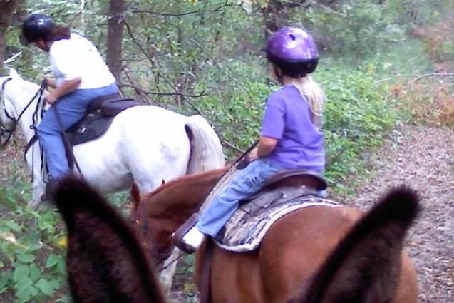 Mom on Cricket and Sarah on Lady heading out on the trail! |