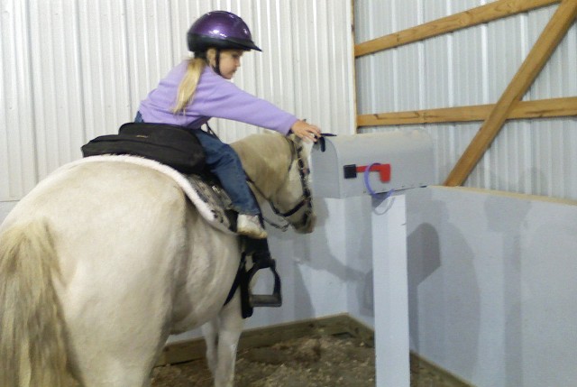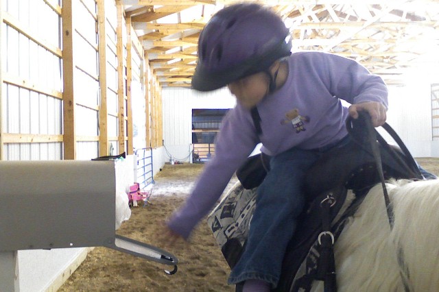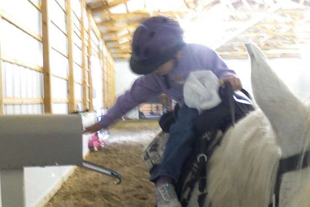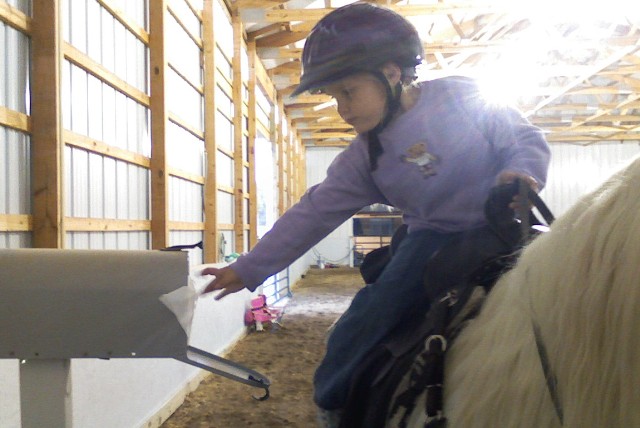 The next set of pictures are of Sarah riding in an indoor arena with obstacles set up in it. One of them was a mailbox with stuff in it. There was also a tarp and a bridge, but we didn't get pictures of those. The following were taken with our camera phone, so they are kind of blurry, but you get the idea.