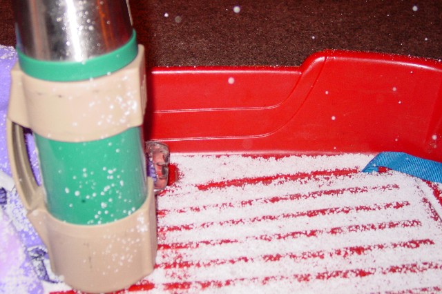 Here is snow accumulating in our wagon, next to our thermos full of hot cocoa.....
