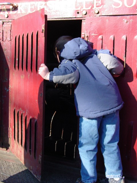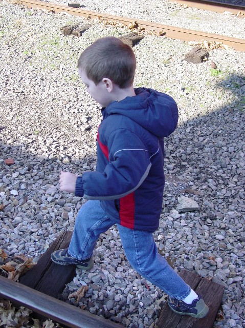 Adam liked walking on the railroad tracks and checking out the engine compartment.