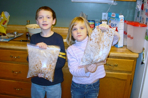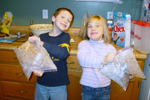 The kids making chex mix. They did have fun making it, even though the picture on the left looks like they are being tortured! LOL! |
