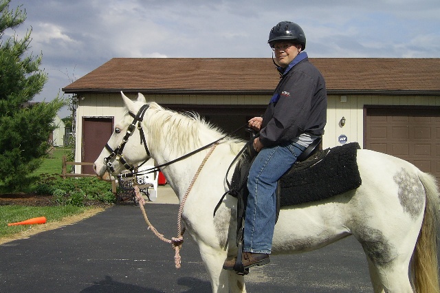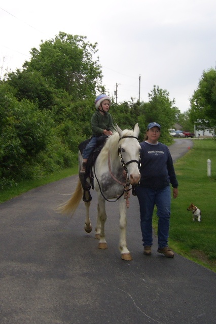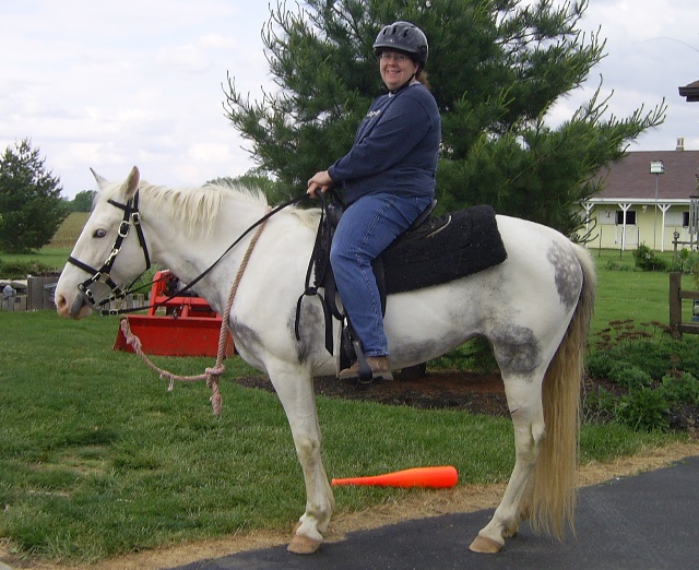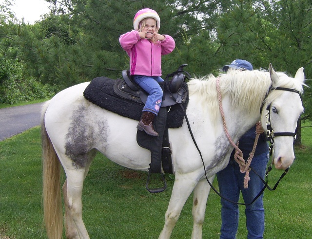 Marybeth on Cricket. Look how long Cricket's tail is!
