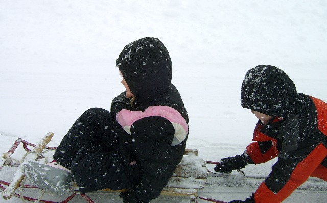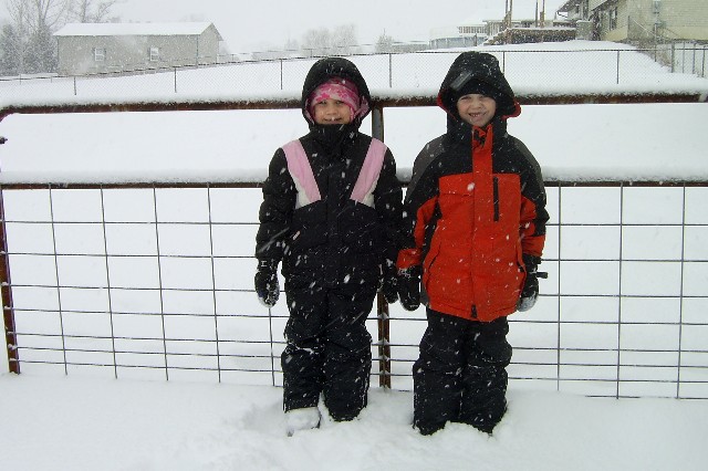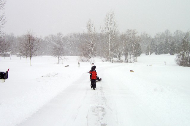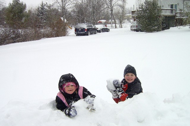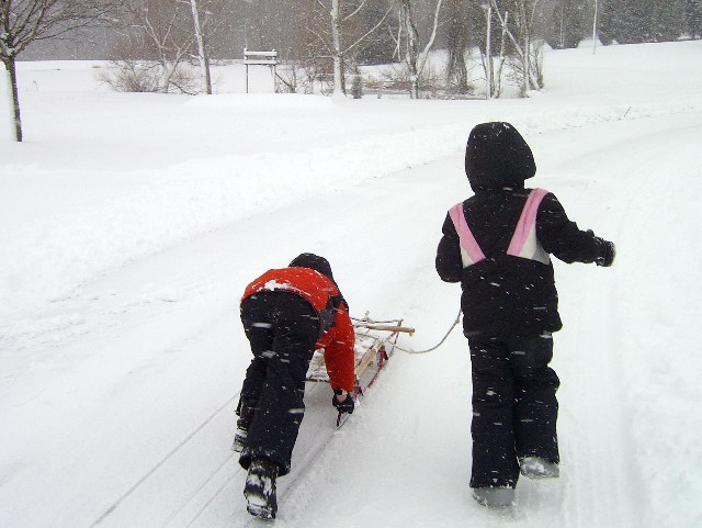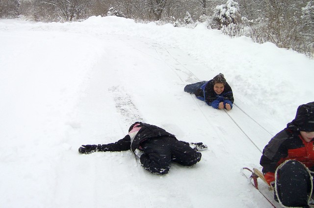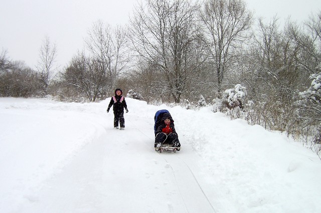 More SNOW on February 9. The kids had their first sled ride, thanks to our neighbor Aaron! |